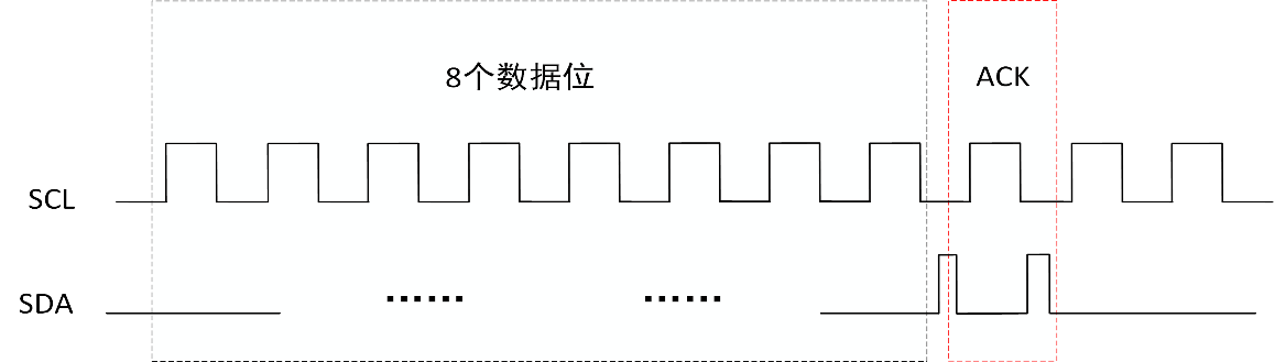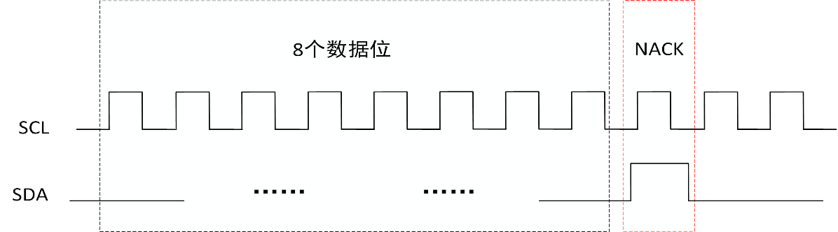 应答位、非应答位:当主机传送8位数据结束后,主机会将SDA线拉高,此时如果从机正确接收数据则会将SDA拉低并在SCL高电平时保持低电平,这个信号为ACK信号。如果在传输8位数据后从机没有将SDA拉低则该信号为NACK。如果出现NACK则表示数据传输出错。