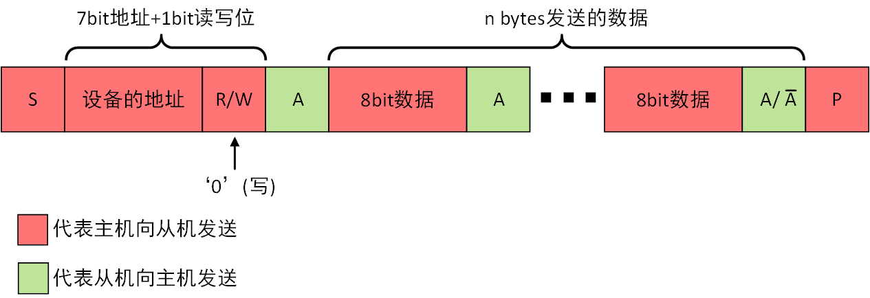 byte组织:SDA上的数据传输是以8bit即一个字节为单位传输的,每一次传输的字节数没有限制,每传输完一个字节后必须跟随一个应答位。